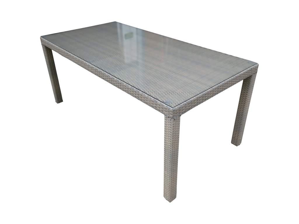 Hliníková konstrukce je opletené elegantním plochým PE ratanem a má kovové chrániče ukončení báze nohou. Deska stolu vyztužená a pokrytá bezpečnostním sklem.